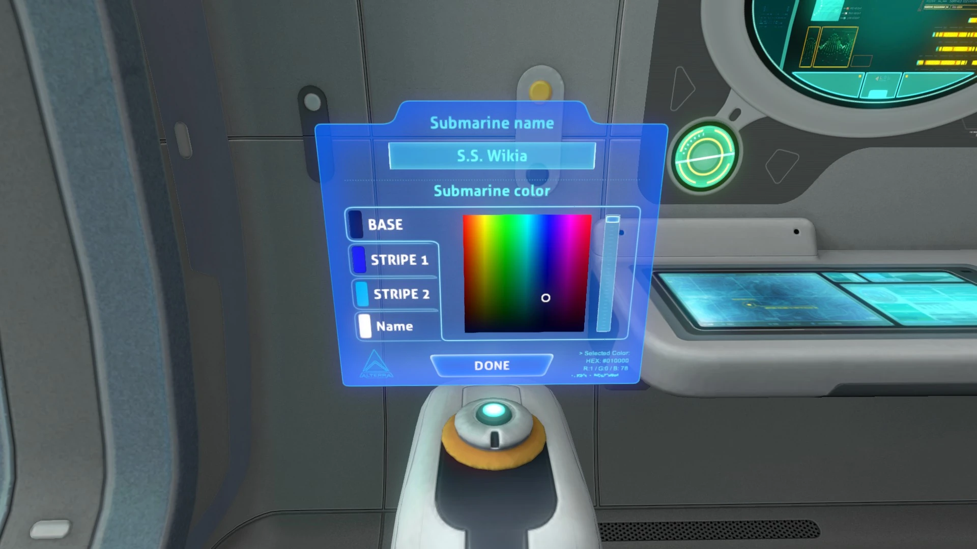 - The cyclops has [the hexcode of the colour we chose](https://vignette2.wikia.nocookie.net/subnautica/images/6/6e/Cyclops1.jpg/revision/latest?cb=20170404160627)(bottom right of the blue screen) but we can't change the values through typing in numbers, which would make this much easier especially if trying to have ships of the same colour. Also the Moonpool's Vehicle Modification Station lacks the hexcode display